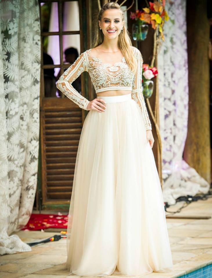 Presença constante nos desfiles de noiva do ano passado os modelos cropped são opções para noivas que buscam ousadia fashion e podem ser ótimos para casamentos mais despojados. Um modelo que chamou a atenção foi o usado pela atriz Bárbara Franca, no último capítulo de “Malhação – Pro Dia Nascer Feliz”.