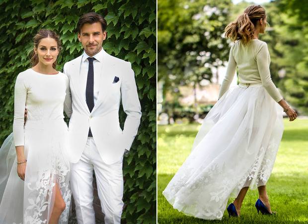 Olívia Palermo, seguiu em seu casamento essa linha de cerimônia intimista e ao ar livre. Ao invés de vestido, a fashionista optou por um conjunto de três peças criadas por Carolina Herrera – um suéter de cashemere off white com aplicações de penas de avestruz e um short branco sobreposto por uma saia branca assimétrica de tule com detalhes de cetim. Nos pés, par de scarpins Manolo Blahnik azul marinho combinavam com a gravata e lenço do noivo.