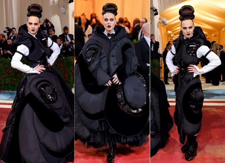 O produtor de teatro americano, Jordan Roth, também apostou em um look “mais de 2 em 1”, já conhecido por outras edições do evento, apareceu com uma composição preta e volumosa, assinada pelo estilista Thom Browne, que de casaco se transformo em vestido longo, e depois, uma versão mais justa ao corpo. Seu cabelo e maquiagem também ajudaram a compor o look.