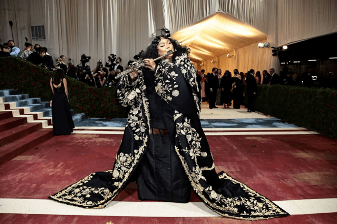 A rapper e ganhadora do Grammy, Lizzo, surpreendeu ao exibir seu casaco, também assinado por Thom Browne, acompanhado por um acessório especial: sua flauta. Segundo ela, em live da Vogue no tapete vermelho, o casaco demorou vinte e duas mil horas para ser produzido. Por baixo usava um espartilho longo, com recortes de cinta-liga. Os acessórios que complementaram sua flauta foram uma chocker de ouro por Lorraine West, e unhas pretas excepcionalmente longas. Ao andar no tapete vermelho do MET, Lizzo deu uma ‘palhinha’ aos presentes e tocou sua flauta.